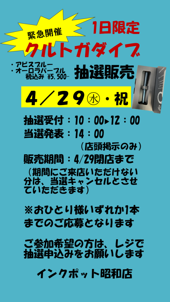 4/29(水・祝) インクポット昭和店【クルトガダイブ抽選販売】
